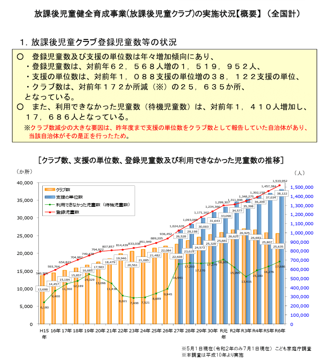 また、厚生労働省(現:こども家庭庁)の調査によれば、令和6年度の学童保育登録児童数は約152万人に達しましたが、その一方で約1.7万人の子どもが待機児童として利用できていない現状があります(下図参照)。